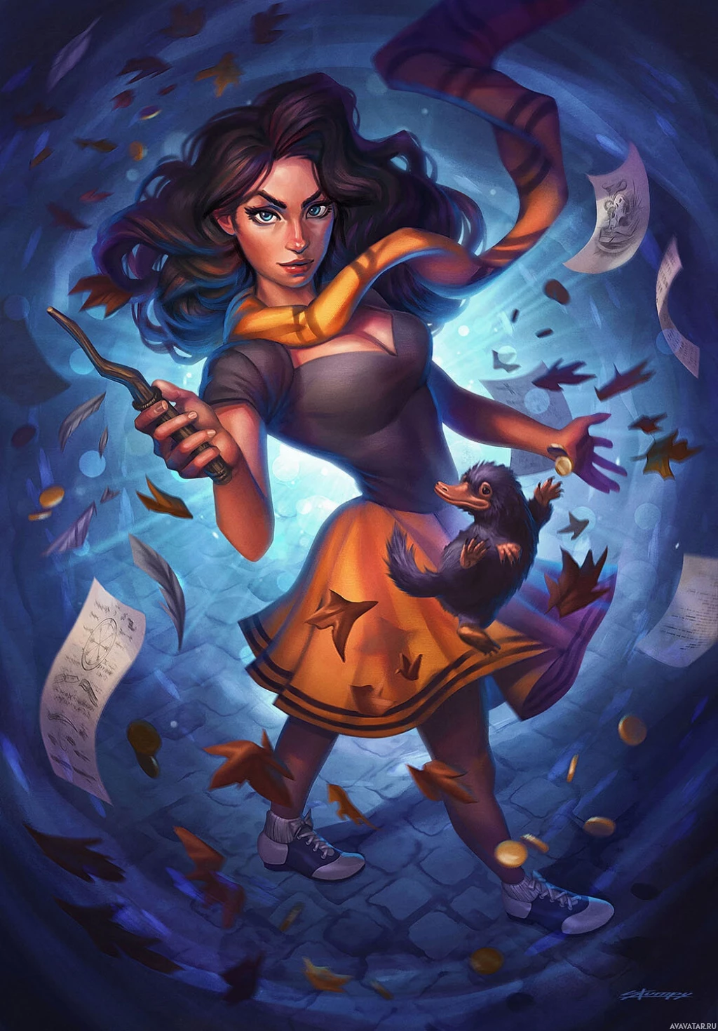 autumn leaves, which could imply that the scene takes place during fall season or is meant to evoke a feeling of magic and change associated with this time of year.