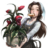 a white apron and a cap, which suggests she might be in the context of gardening or working at a nursery. The artwork has a cute and whimsical style, emphasizing the fantastical elements of