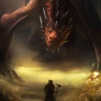 a dramatic moment from the story where the dragon's wealth is threatened by a brave adventurer.