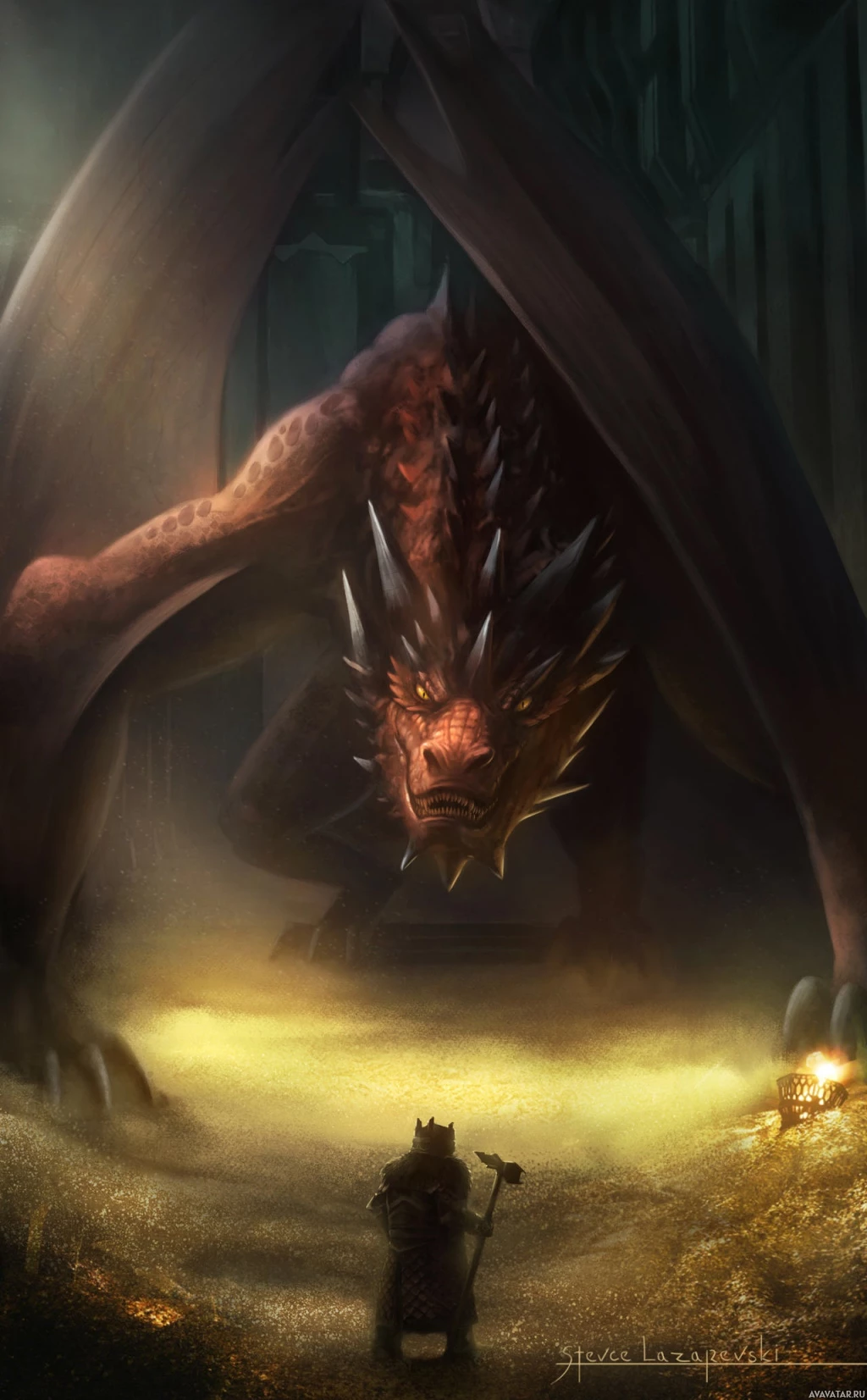 The image depicts a scene that appears to be inspired by J.R.R. Tolkien's Middle-earth, featuring a character resembling Smaug, the dragon from "The Hobbit" series. In this artistic rendition, a large