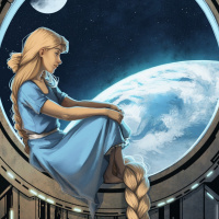 blonde hair, sitting on the edge of what appears to be a spacecraft or astronaut capsule. She is looking out towards a planet in the distance, and the moon is visible in the sky, suggesting she might be in