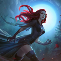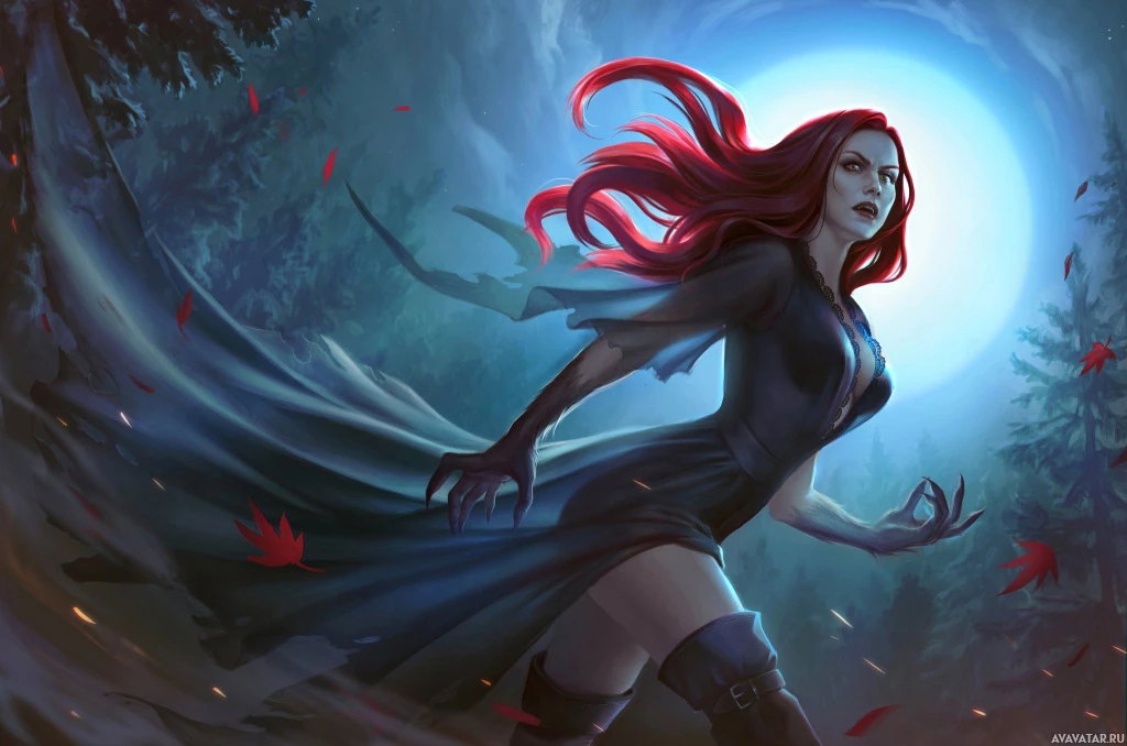 На картинке изображен персонаж женского пола с рыжими волосами, изображенный в стиле фэнтези. Она одета в темную одежду и плащ, который, кажется, развевается у нее за спиной, когда она движется вперед по лесу ночью при полной луне. На земле разбросаны осенние листья, указывающие на время года. Общая атмосфера наводит на мысль о мистическом или волшебном повествовании.