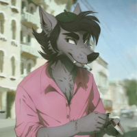 The image features a wolf character, which is anthropomorphized, walking on a street. It appears to be an animated or illustrated scene rather than a real photo of a wolf in its natural habitat. The character is wearing human clothing and has a cigarette in hand, suggesting a human-like behavior. There are buildings in the background that suggest an urban setting.