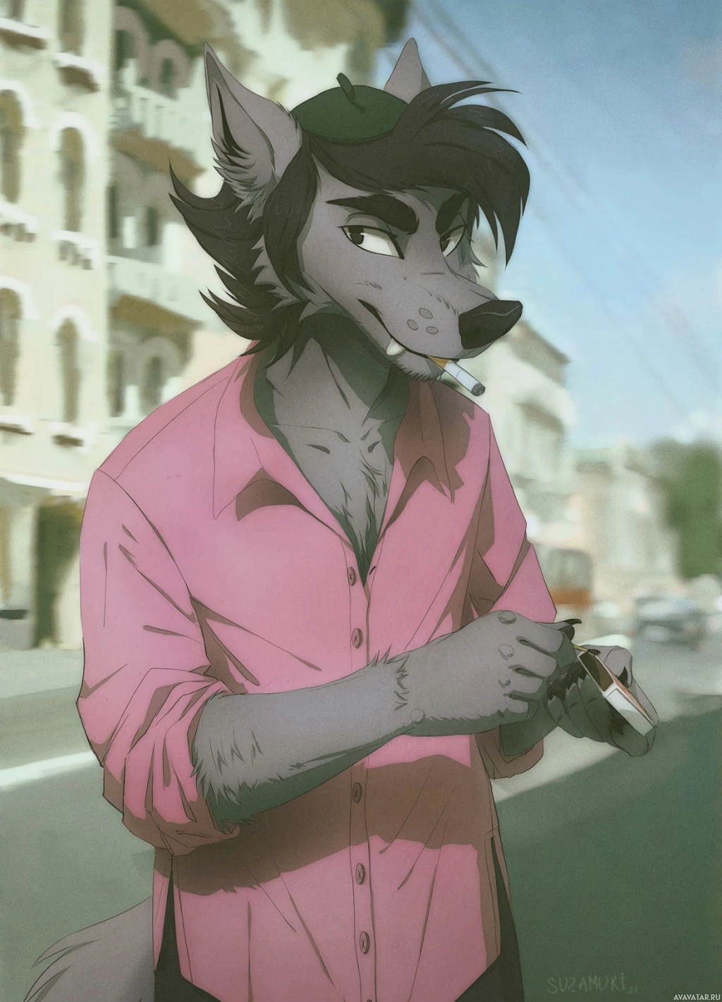 На картинке изображен антропоморфизированный волк, идущий по улице. Это скорее анимированная или иллюстрированная сцена, чем реальная фотография волка в его естественной среде обитания. Персонаж одет в человеческую одежду и держит сигарету в руке, что наводит на мысль о поведении, подобном человеческому. На заднем плане видны здания, которые наводят на мысль о городской обстановке.