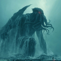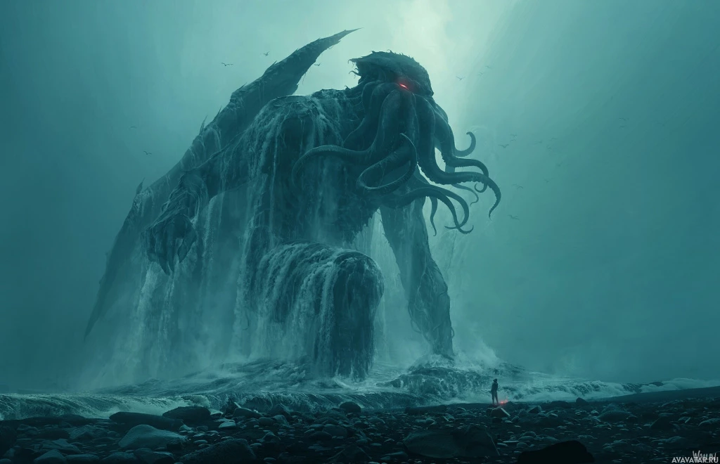 a fantasy scene with the monster Cthulhu, which is often associated with Lovecraftian horror. In the center of the image stands an octopus-like creature with multiple tentacles and