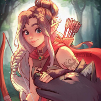 a forest setting, possibly indicating that she is in the midst of hunting or adventure. The character is styled in typical fantasy fashion, suggesting this could be from a story set within
