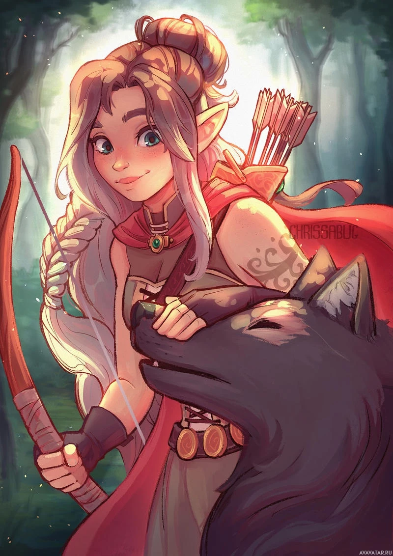an animated character who appears to be an elf, holding a bow and arrow. She has