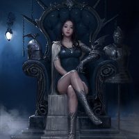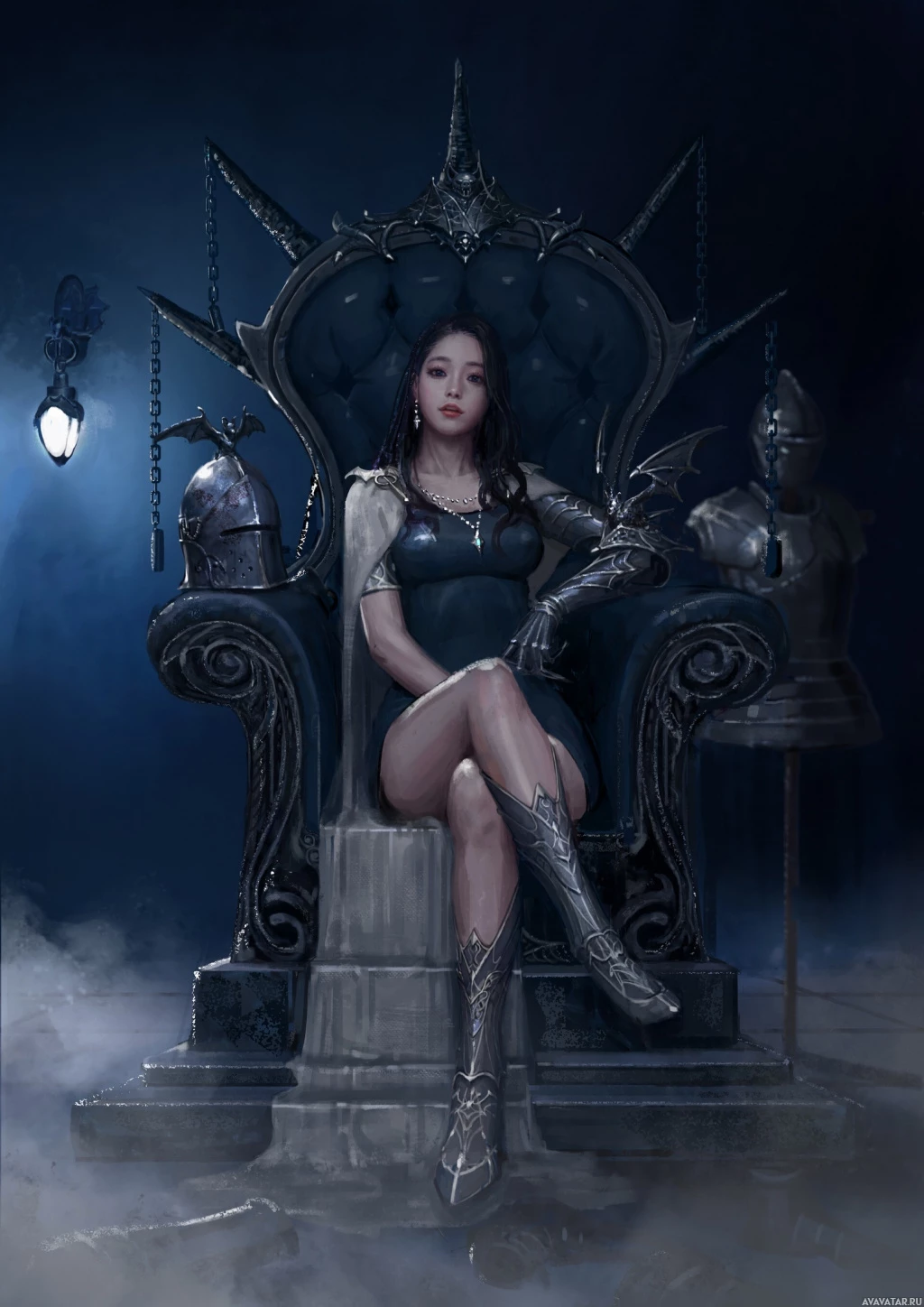 fantasy world. There are elements such as chains and a scepter in the background that further enhance the regal and powerful theme of the image.