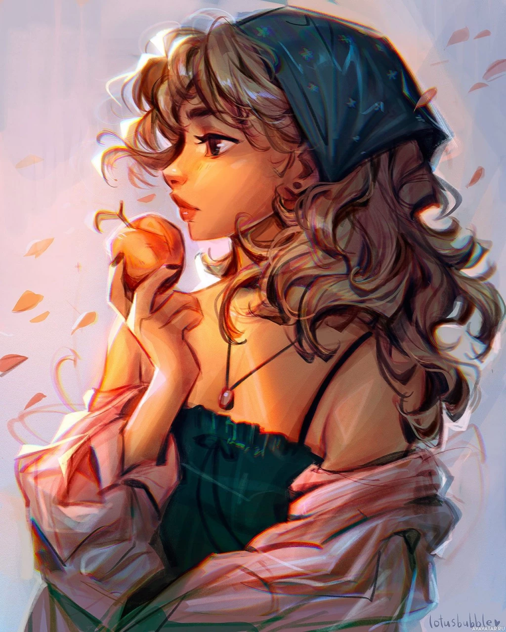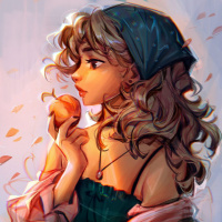 blonde hair and is holding a piece of fruit in her hand that resembles a stylized apple. The character is wearing