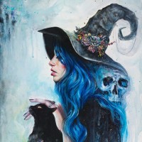 blue hair and is wearing a witch's hat, with a cat sitting beside her. There are also skulls depicted in the background, which could imply themes related to mortality or the supernatural. The style of the painting suggests it may be an example of