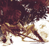 lush foliage. In his hands, he holds a sword, suggesting that he might be preparing for combat or has just emerged from battle. The art style is detailed and expressive, capturing a moment of