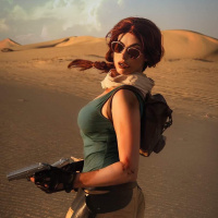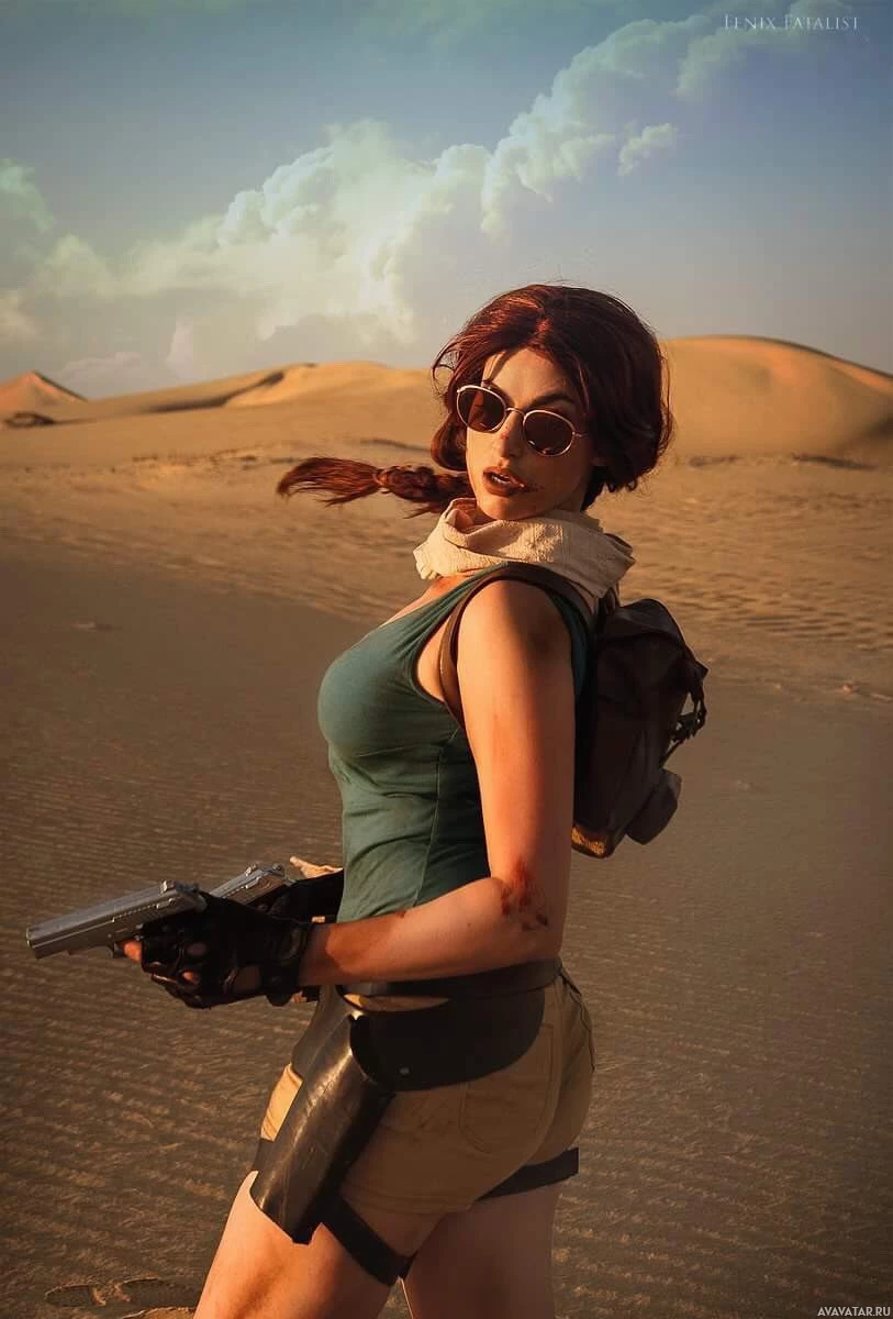 The image shows a person dressed as Lara Croft, the iconic character from the Tomb Raider video