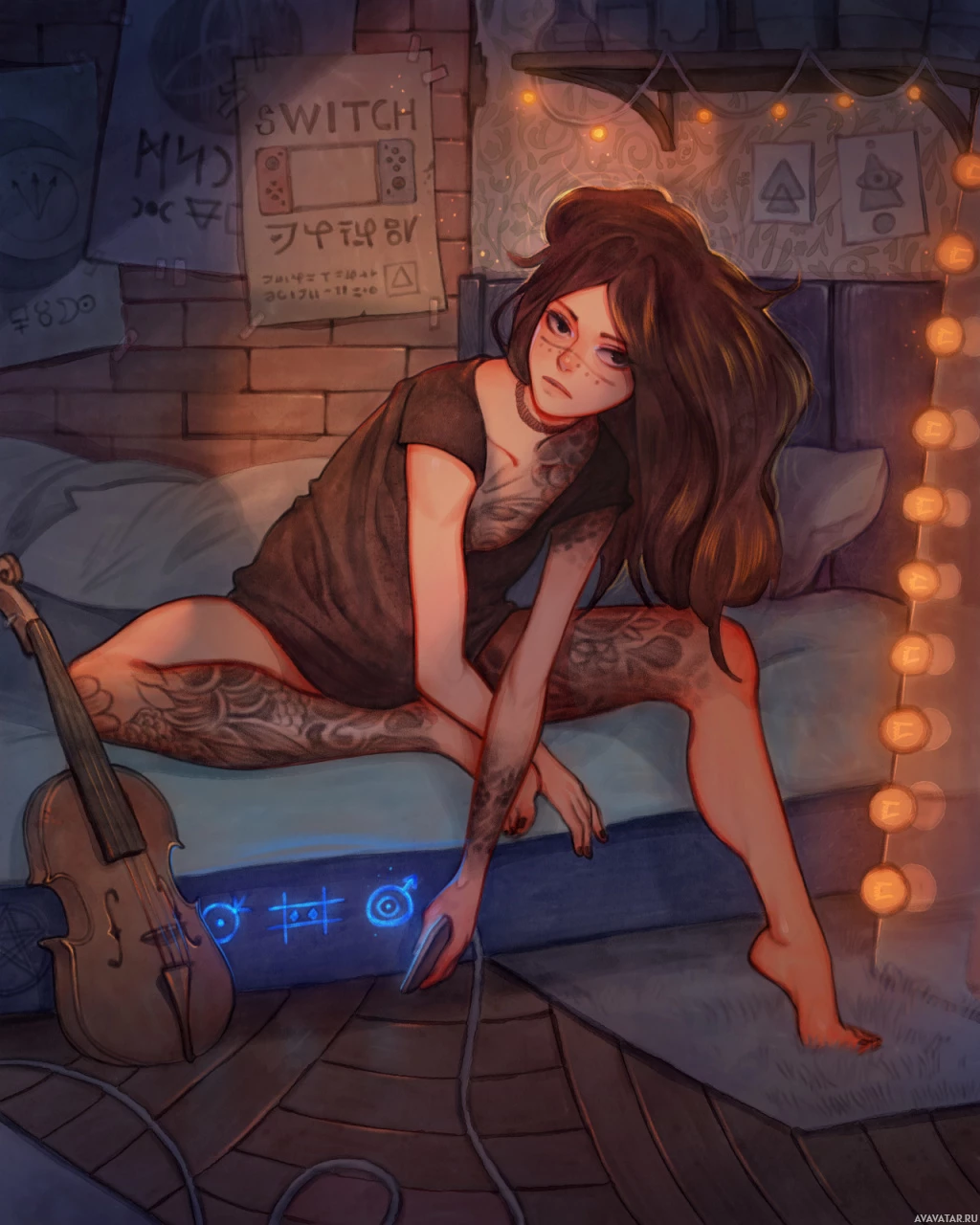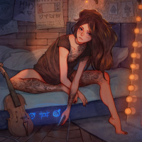 a sleeveless top, which leaves her midriff exposed, and there are visible tattoos on her upper arms. In front of her is a string of lights that seem to be providing a soft glow to the scene, and she appears to be engaged in some activity involving music or sound recording, as indicated by the presence of what looks like a mixing console with knobs and sliders. The setting seems to be an indoor environment that resembles a small room or studio, given the presence of the string lights, which are often used for ambiance or low light situations where they can be plugged into a power source without hanging from the ceiling. The overall mood of the image is relaxed and contemplative, with the character appearing to be lost in thought or perhaps preparing to record music or a podcast.