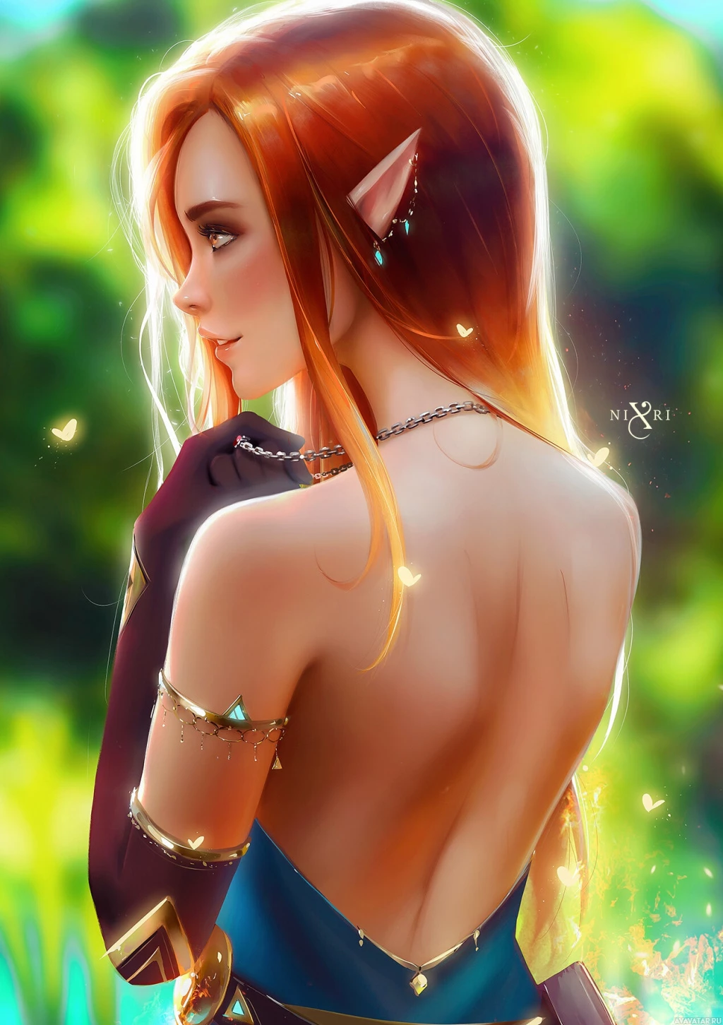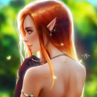 a female character with red hair styled in twin tails, and she appears to be an elf given her pointed ears. She is wearing what looks like fantasy-themed attire, possibly armor or
