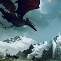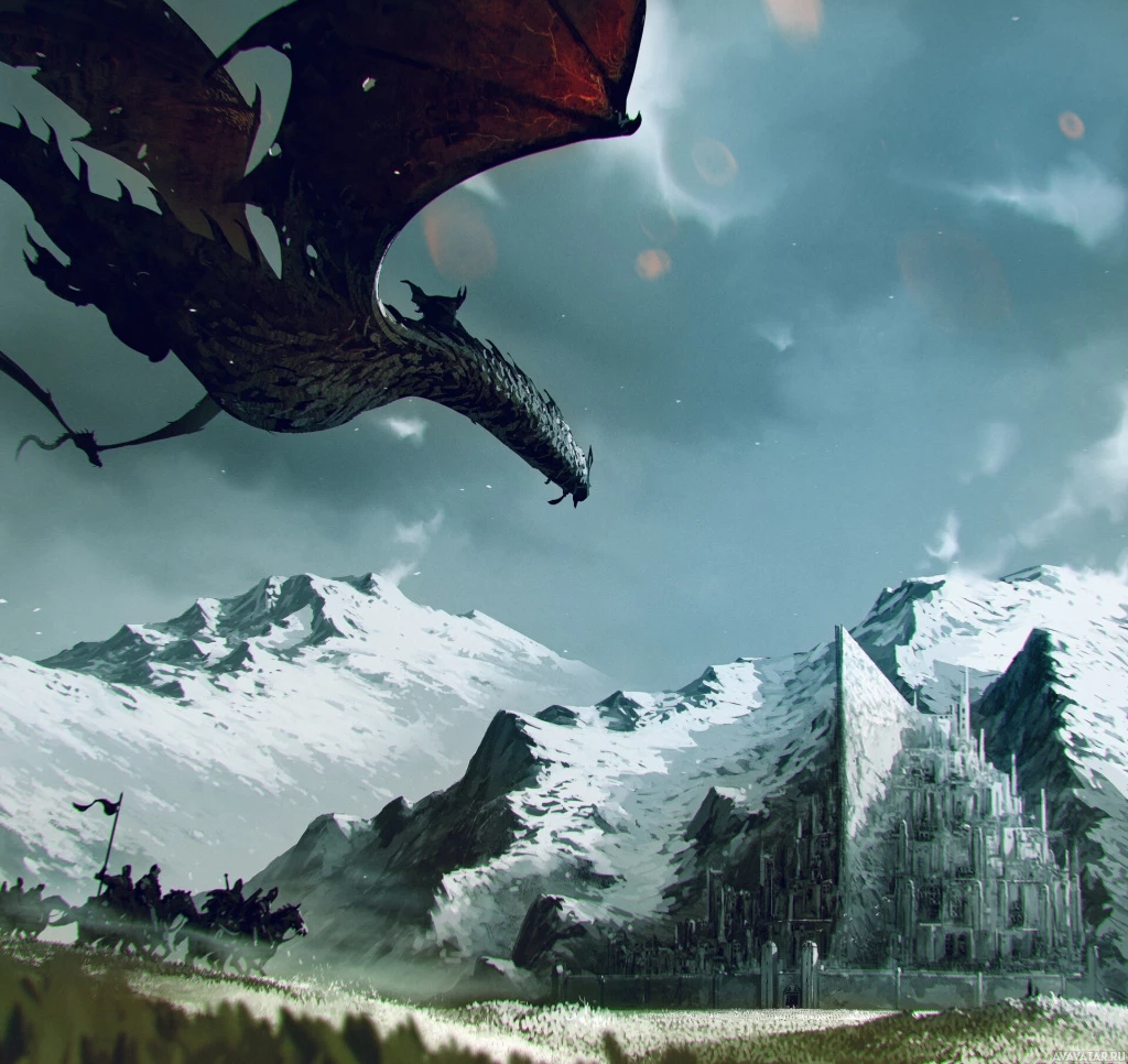 a fantasy scene featuring a dragon flying in the sky above a castle on top of a mountain. Below the castle, there is