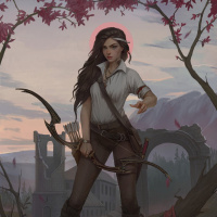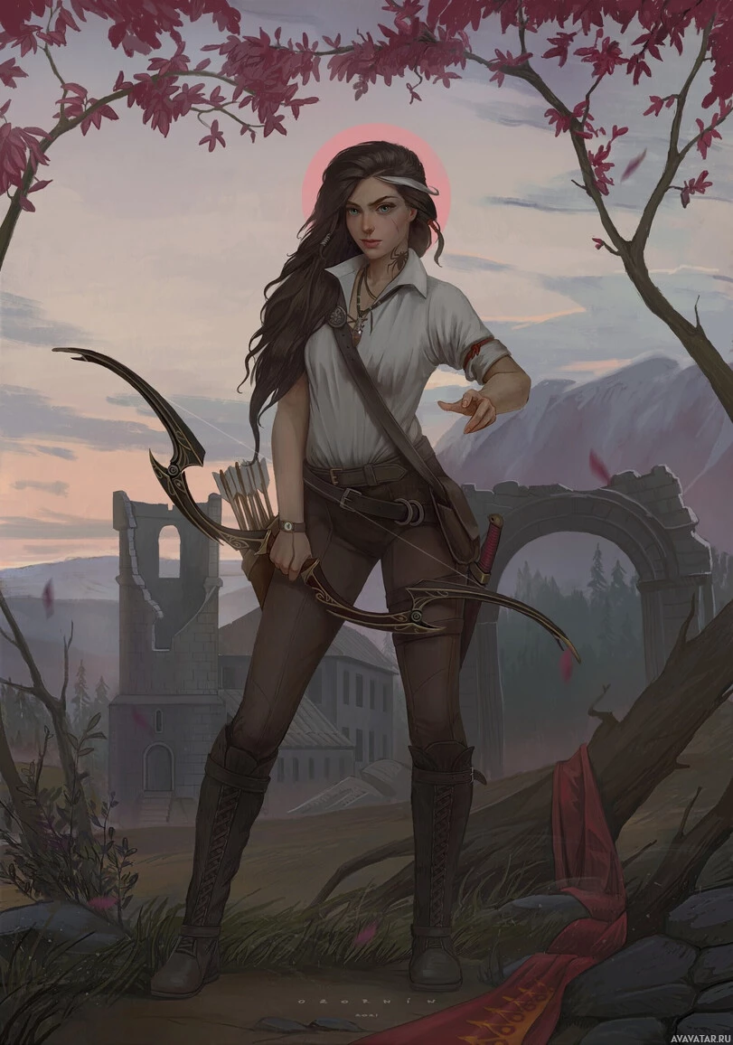 brown hair and is dressed in what appears to be period-style clothing, with elements such as a corset and high boots. In her right hand, she holds a bow, suggesting that she might be an archer or involved in some kind of