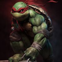 The image shows a character known as Raphael from the Teenage Mutant Ninja Turtles franchise. He is depicted in a crouched position with his fists clenched, ready for action. The background has a dark tone, highlighting the figure.