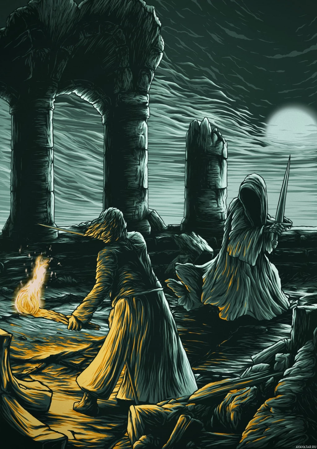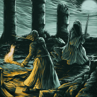 barren landscape with a dark, ominous sky that could indicate either dusk or an approaching storm. The characters are dressed in attire that resembles traditional fantasy or