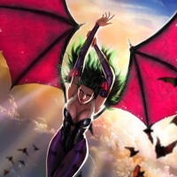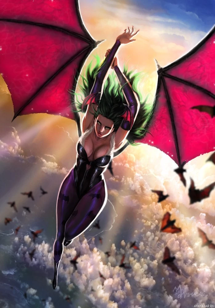a female character with large red bat-like wings, reminiscent of a vampire. She is wearing purple and black attire that resembles superhero or fantasy-themed costumes. Her pose suggests she is in flight, soaring through the sky which is filled with