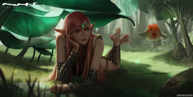 red hair and is seated on the ground, surrounded by greenery that includes what appear to be large leaves reminiscent of tropical plants. There's also