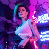 The image features a person standing in an environment that resembles a neon-lit street corner, possibly inspired by the aesthetic of