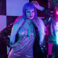 the video game "Cyberpunk 2077." The individual is wearing a dress with glittery detailing and a fur stole or coat, complemented by an accessory that appears to be a part of their costume. They have