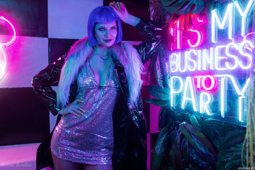 dyed hair and are holding their hand up near their head in a pose that could suggest confidence or defiance. The background includes neon signs that read "MY BUSINESS PARTY" which is a phrase often associated with the game "Cyberpunk 2077," suggesting that this