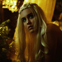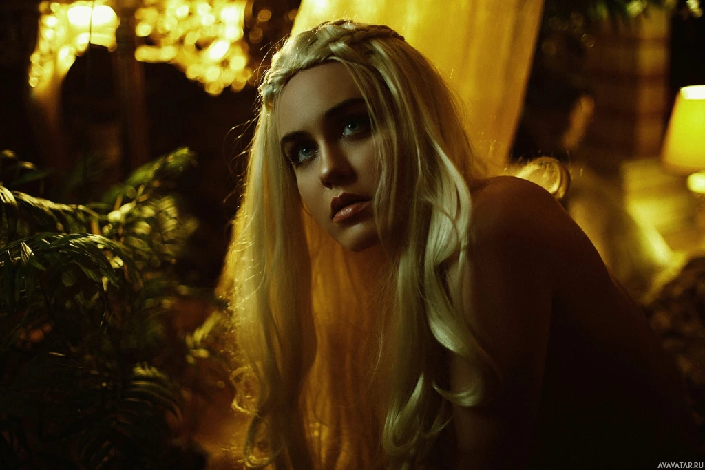 an indoor setting, possibly a room illuminated by warm lighting that casts soft shadows around them. The expression on the face is one of contemplation or introspection, as the person looks directly at the camera with their lips parted slightly. The style of the image suggests it could be from a film, a play, or a photo shoot designed to evoke a dramatic or fantastical mood, possibly due to the reference to "white hair" and "girl."