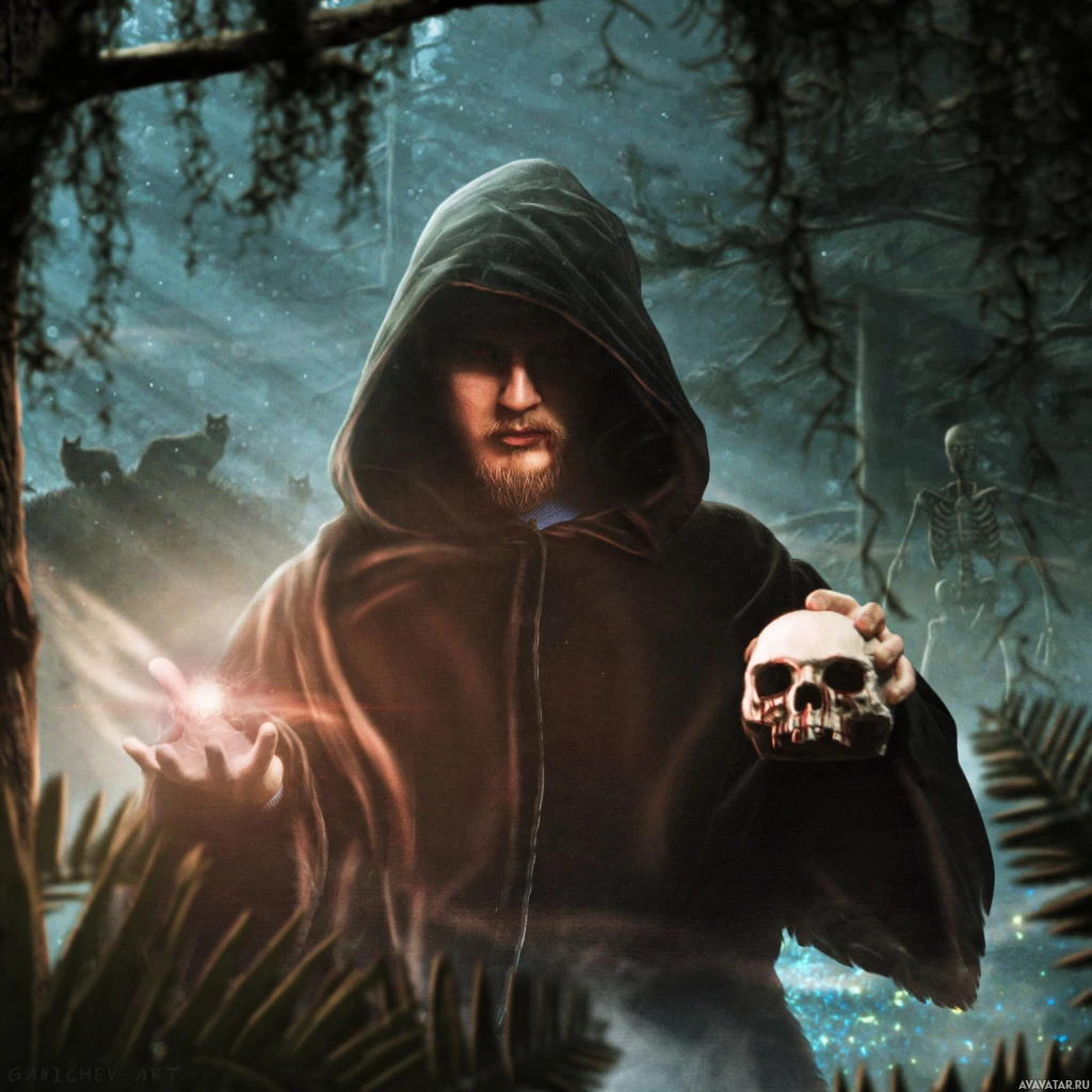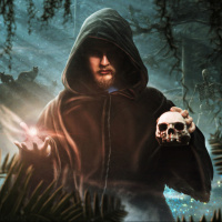a hooded cloak and is holding a skull between his fingers. Behind him, there are elements of fantasy and mysticism such as misty surroundings, twisted trees, and the silhouettes of other