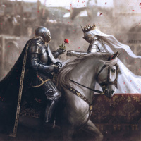 regal demeanor, wearing a crown and holding a flower. The setting suggests a historical or fantasy context, possibly during a medieval or feudal era given the attire of the riders. There are