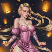 The image features an animated character that resembles Rapunzel from the Disney movie "Tangled." She is depicted in a stylized, artistic manner with a pink and purple dress, holding a lantern or candle. Her hair is also styled to look like a cascade of light. The background suggests a nighttime scene with floating lanterns, creating a magical and dreamy atmosphere.