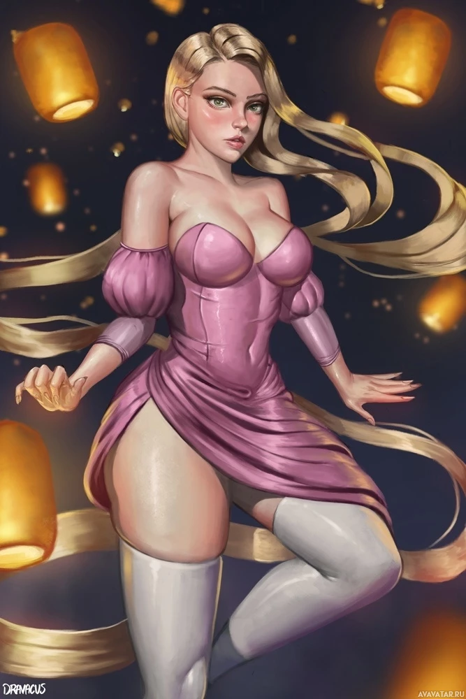 На картинке изображен анимационный персонаж, напоминающий Рапунцель из диснеевского фильма "Запутанная история". Она изображена в стилизованной художественной манере, в розово-фиолетовом платье, с фонарем или свечой в руках. Ее волосы также уложены в виде каскада света. На заднем плане изображена ночная сцена с плавающими фонарями, создающая волшебную и мечтательную атмосферу.