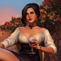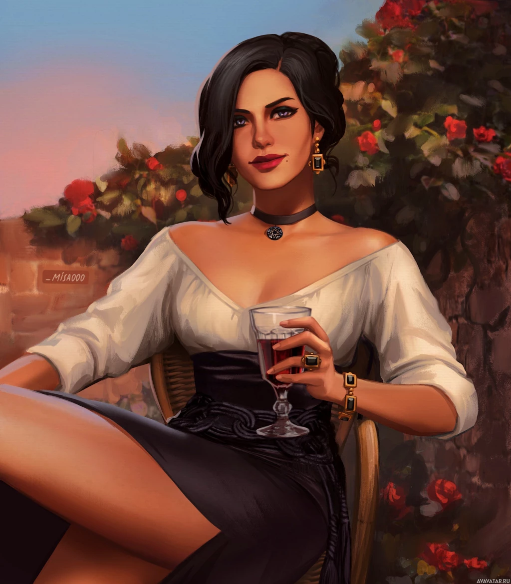 a glass of wine in hand. Her attire and accessories suggest she may be a witch or a sorceress, fitting her