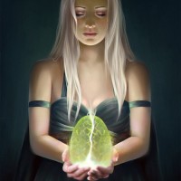 closed eyes holding an egg. This character has long, flowing