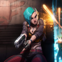 a female character with turquoise hair, holding a pistol and pointing it towards the viewer. She appears to be in an intense or action-oriented scene, possibly from