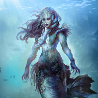 The image depicts a fantasy mermaid. She is shown in an underwater setting, with her tail resembling that of a fish, and she has human-like features such as arms and hands. Her hair flows around her head, and she has what appears to be scales on her body. The background suggests deep water with light filtering through from above.