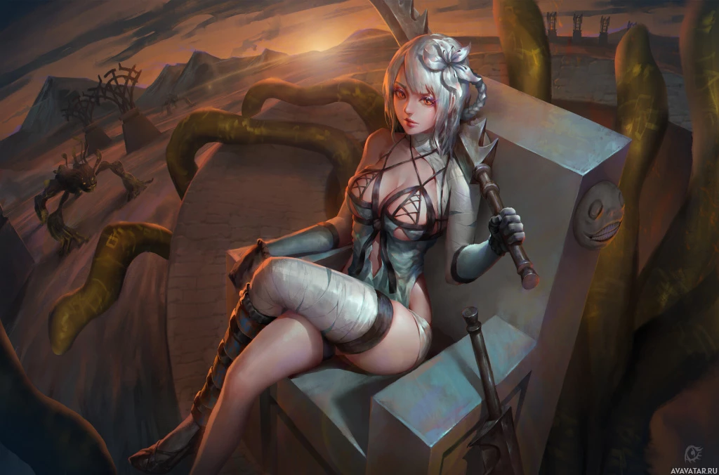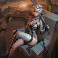 white hair, seated on what looks like an elaborate metal throne. She is holding a sword in one hand and has another sword resting beside her leg. She is wearing armor with some