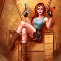 The image features an illustrated character who resembles Lara Croft, a well-known
