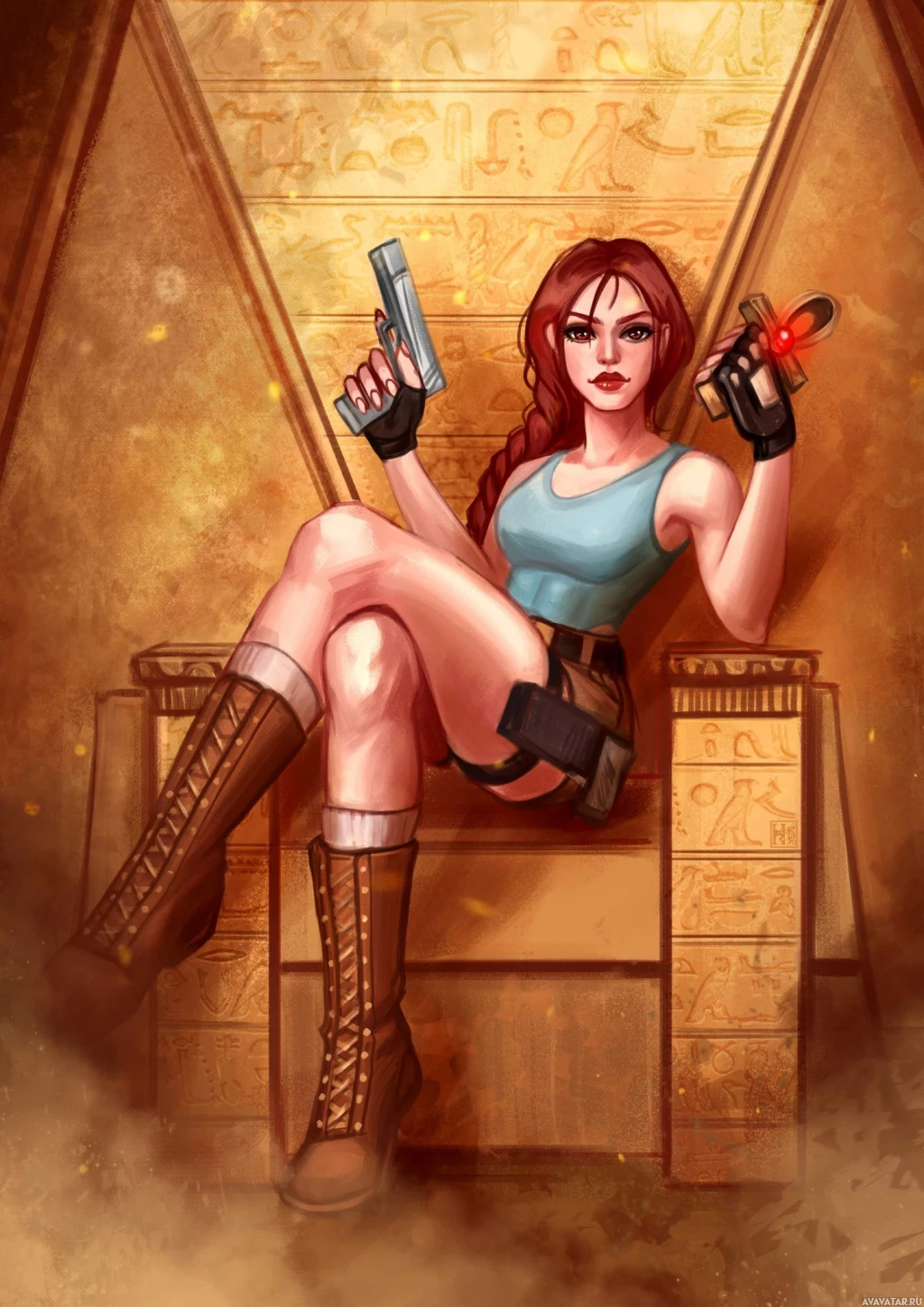 a tank top and cargo pants, and has a gun in her hand, which is often associated with Lara Croft's adventurous persona. She also has a whip attached to her waist, another
