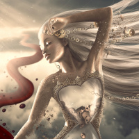 white hair, closed eyes, and her hand on her chest. She appears to be a representation of