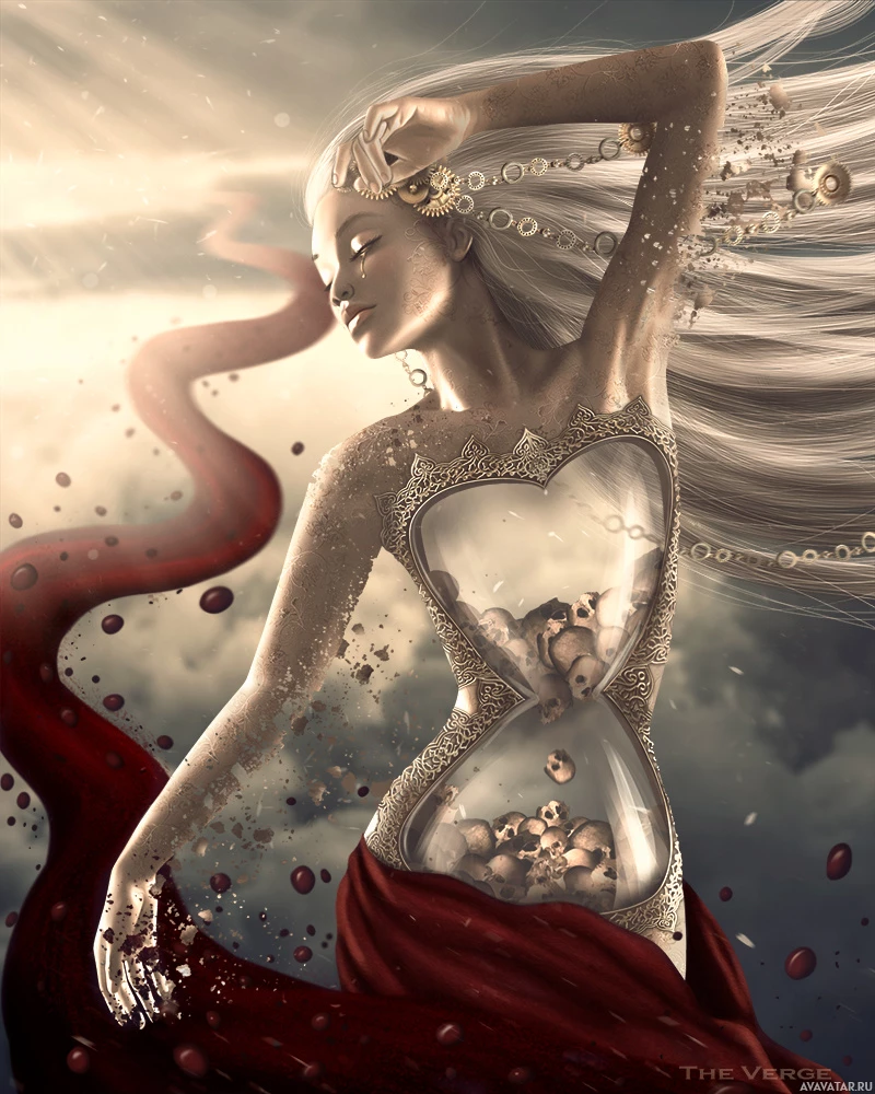 the concept of time, possibly referencing the idea of life being a limited duration, as symbolized by the hourglass she is holding. There are also elements such as what seems like a skull and bones, which might suggest mortality or the fragility of