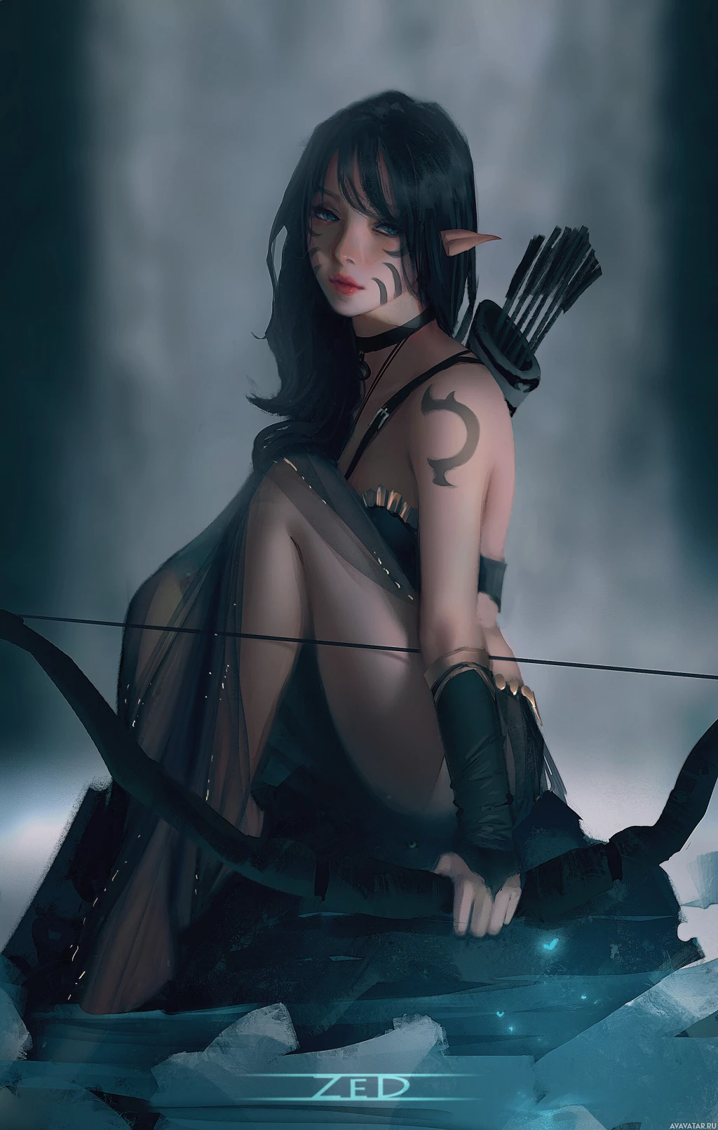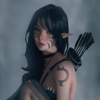 female character depicted as an archer, possibly inspired by fantasy or elf themes. She has pointed ears which are commonly associated with elves in various