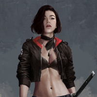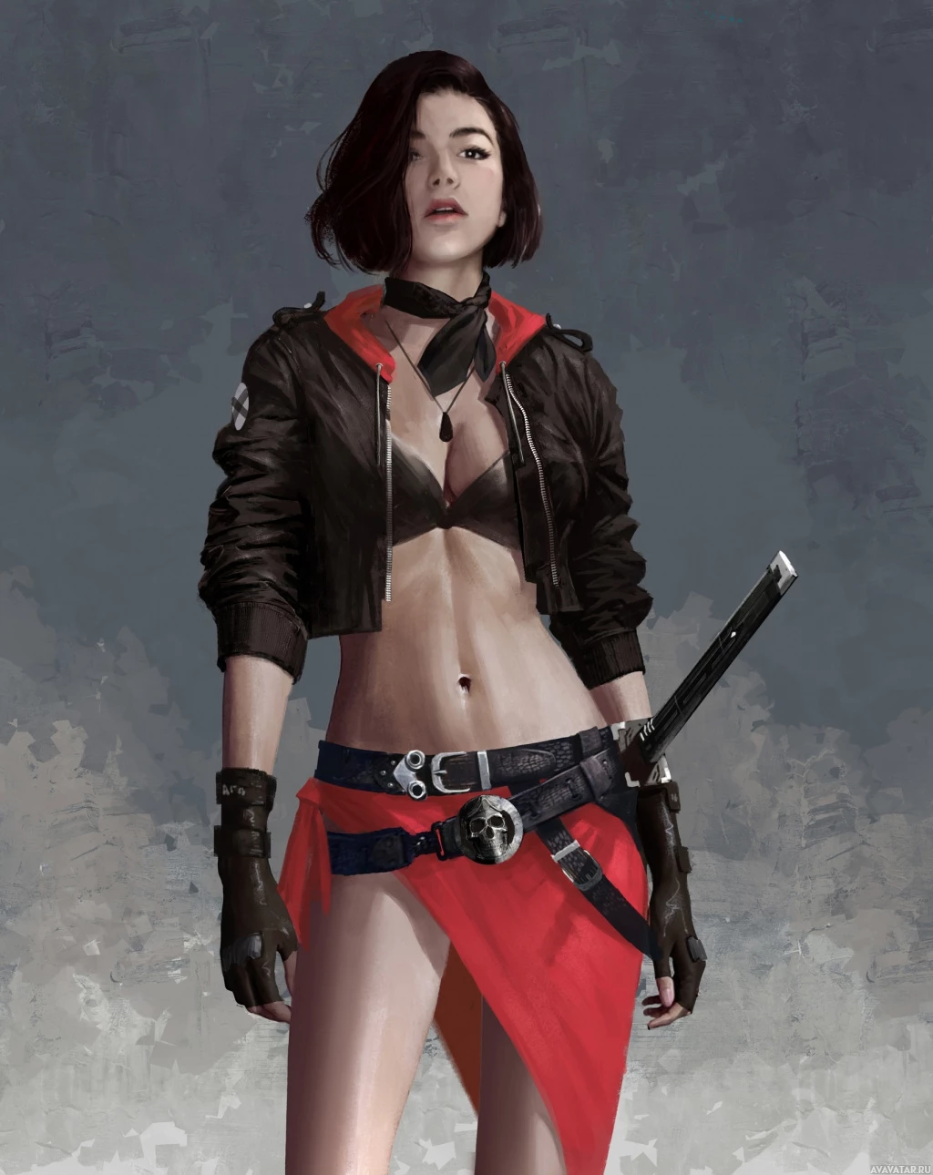 short hair and is standing against a neutral background that suggests an artistic or conceptual setting rather than a real environment. The character's pose is confident and assertive, suggesting she might be a warrior or heroine.