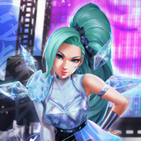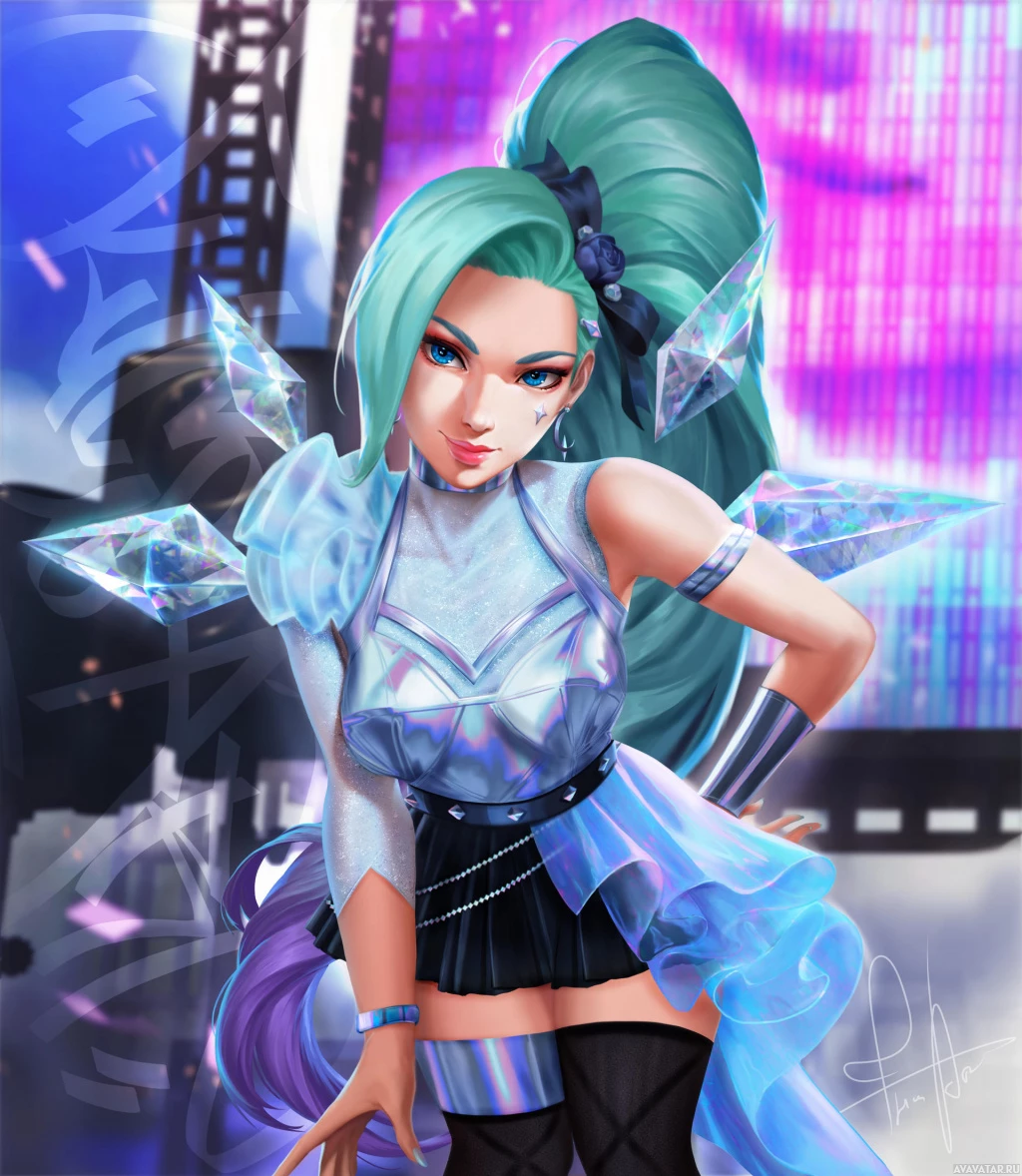 an animated character with turquoise hair, styled in a bob cut and adorned with what appears to be blue accessories. She has striking