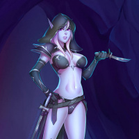 fantasy character, commonly known as a Drow. This character is depicted with a hood and is holding what appears to be a dagger in her right hand. She has pointed ears, typical of fantasy representations of elves, and is wearing