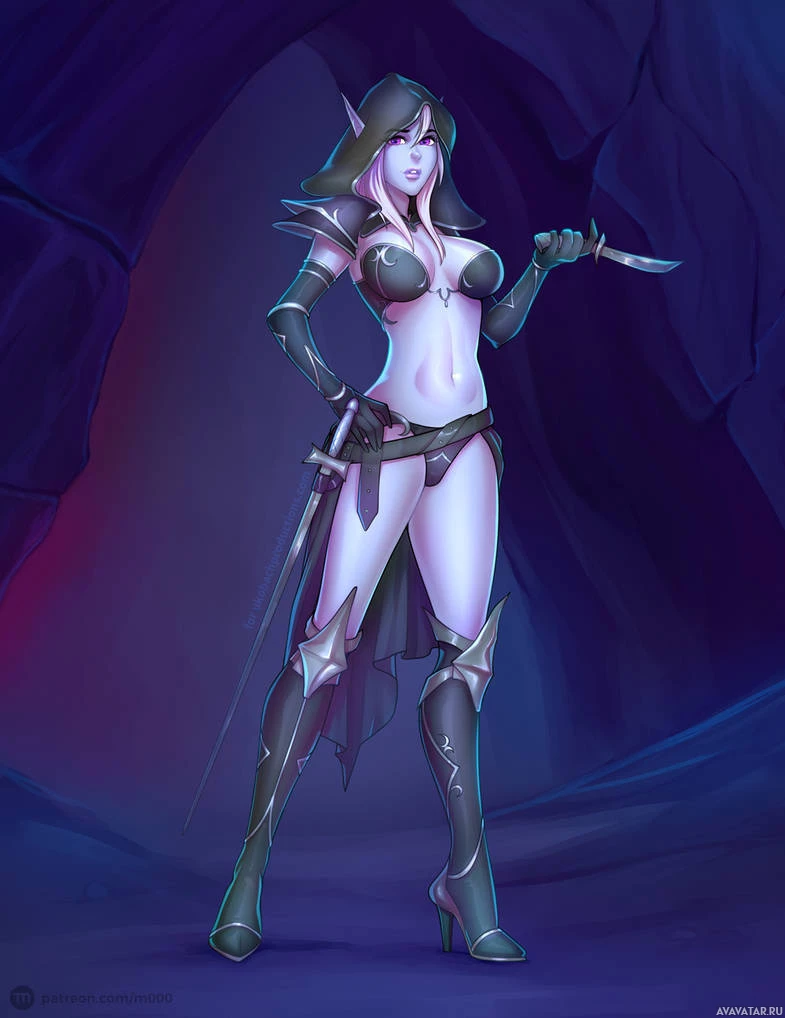 a dark outfit with elements that suggest she may be from a darker or more sinister portrayal of elves often seen in fantasy media. The setting looks like a dimly