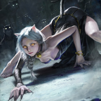 several cats of varying sizes and colors, suggesting that she might be interacting with them or preparing to engage with them. The setting seems to be dark and moody, which could imply a nocturnal or mysterious environment. It's a fantasy-themed image, given the stylized