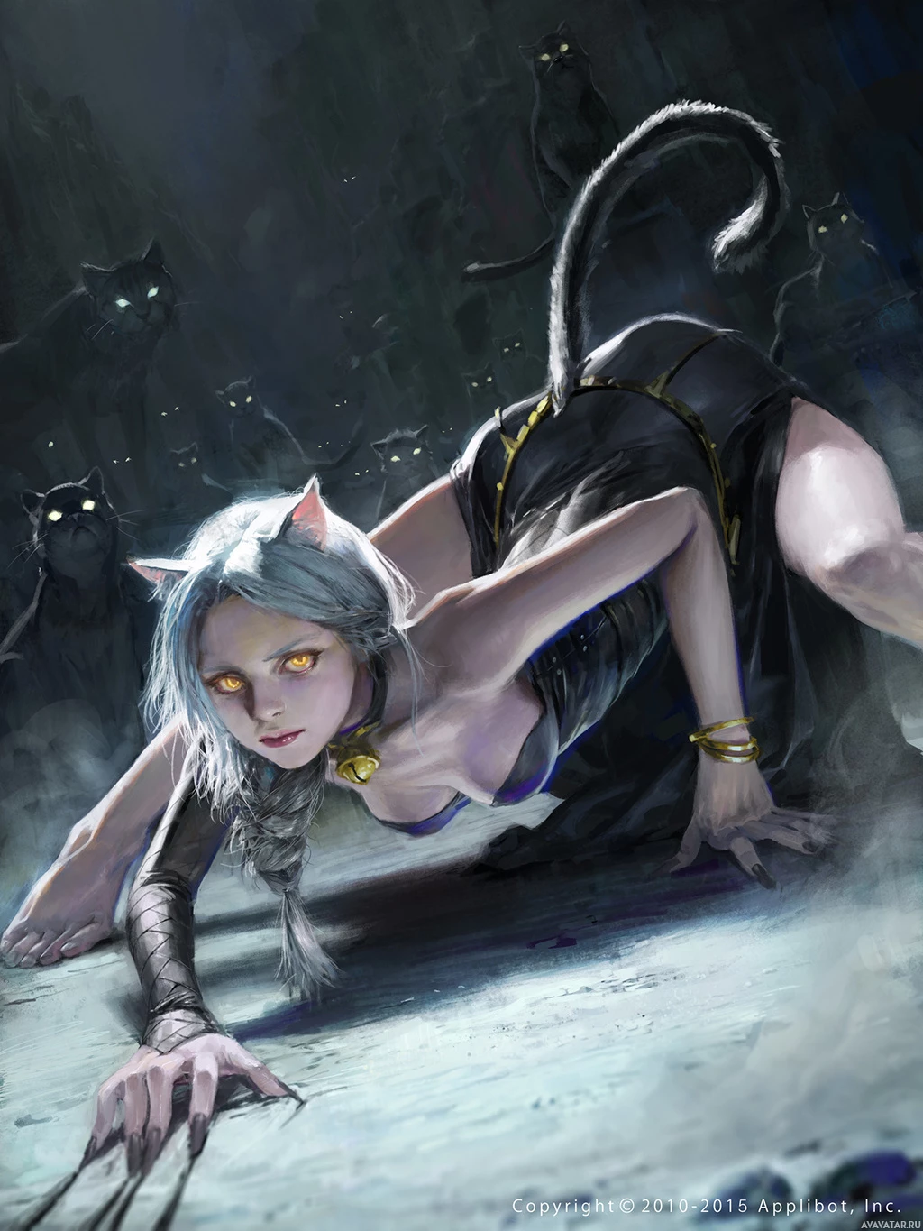 an illustrated character with cat-like ears and features, who appears to be in a crouched or hunting position. Surrounding her are
