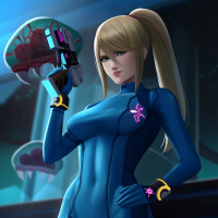 The image features an illustrated character that appears to be Samus Aran from the "Metroid"