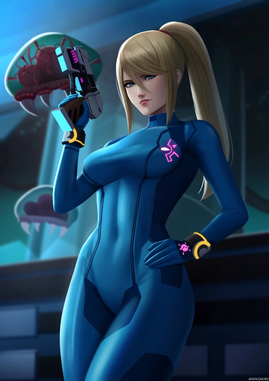 video game series. She is depicted in her iconic blue and grey power suit, which is often referred to as a "zero suit" or "samus outfit," equipped with various